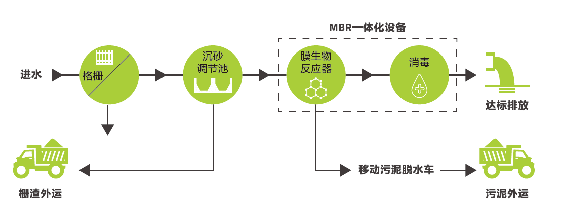 我司一体化设备采用A2O-MBR工艺,处理方法以生化为主,物理方法为辅。经由污水干管自流而来的污水首先通过厂区格栅被拦截掉大粒径的悬浮物与漂浮物,然后流入调节池进行水质水量的调节,再经自清洗过滤器过滤后进入A2O-MBR污水处理站。一体化设备由厌氧池、缺氧池、好氧池和MBR膜组合而成,并集合紫外消毒管和电磁流量计,该装备主要去除有机物、氨氮、SS和磷。MBR出水达标排放,剩余污泥定期排入贮泥池,通过移动污泥脱水车脱水处理后,泥饼进行填埋或绿化处置。