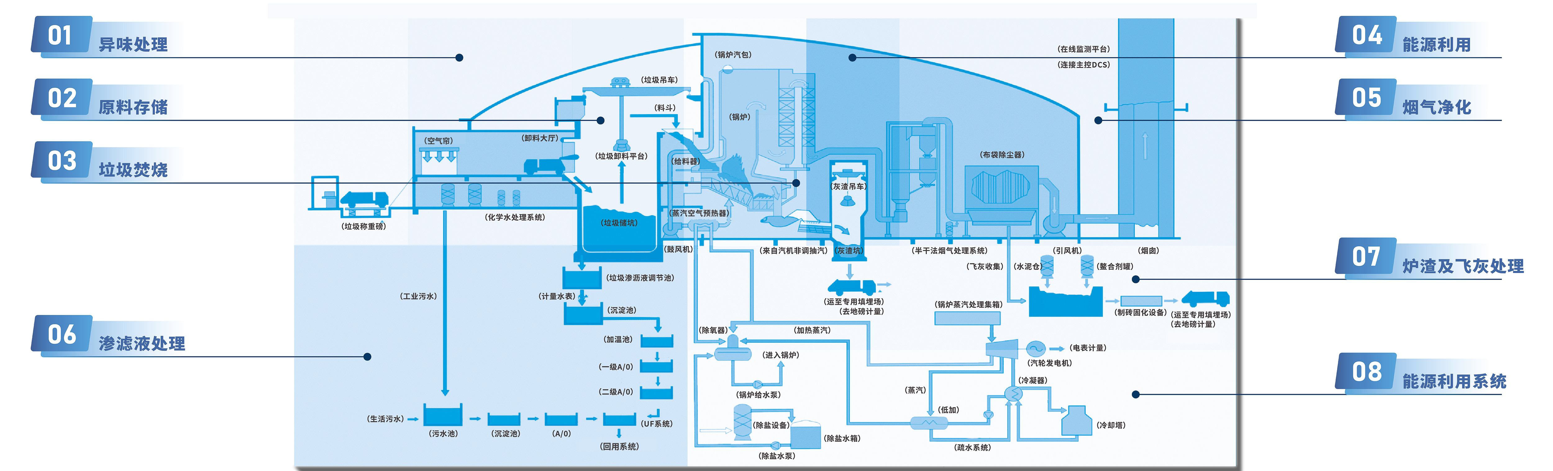 HTH.COM华体会环境生活垃圾焚烧发电处理模式将全流程划分为八大模块,构建囊括垃圾入库、储存、焚烧,烟气净化、渗滤液处理、炉渣及飞灰处理、热能产生、能源利用的八大系统。